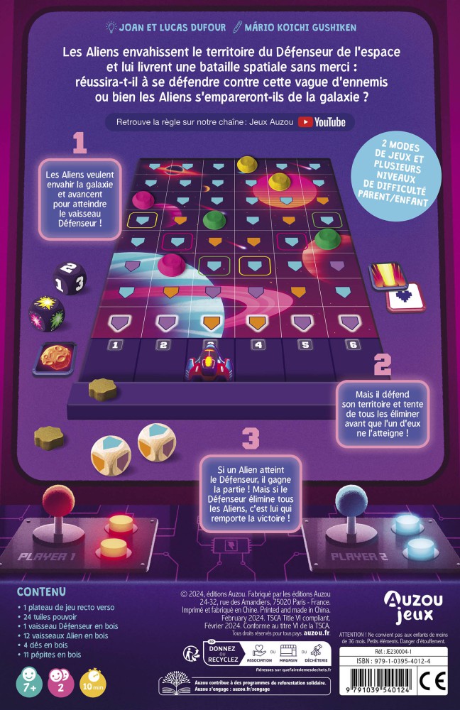 Contenu : 1 plateau de jeu recto verso / 24 tuiles pouvoir / 1 pion vaisseau défenseur en bois / 12 pions vaisseaux aliens en bois / 4 dés en bois / 11 pépites en bois