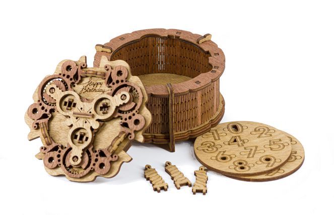 Ce coffret cadeau en bois en forme de gâteau d’anniversaire, est à la fois une boîte à mécanisme et un casse-tête original. Personnalisable il vous permet d’afficher l’âge exact du destinataire sur sa face supérieure. À l’intérieur, un compartiment secret peut accueillir un petit cadeau ou un message spécial pour un effet de surprise garanti ! Pour accéder à ce trésor caché, l’heureux élu devra résoudre trois énigmes séquentielles. Un cadeau ludique, élégant et réutilisable qui fera sensation auprès des petits comme des grands