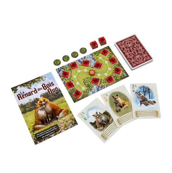 Le Renard des Bois: Duo est un jeu de plis coopératif à communication restreinte pour deux joueurs. Pour remporter la partie, ramassez ensemble toutes les gemmes sur le sentier forestier. Sans se parler, les coéquipiers doivent trouver le bon tempo des 11 plis à remporter ou à laisser, afin que le marqueur d’équipe se déplace sur les bonnes cases Gemme. Mais vous n’avez que trois manches pour y arriver ! Les cartes impaires offrent un pouvoir pour maîtriser vos déplacements d’un bout à l’autre du plateau Forêt. Et si le marqueur sort du sentier, le chemin se réduit et il sera de plus en plus difficile de ne pas se perdre dans les bois, à la merci des fées…