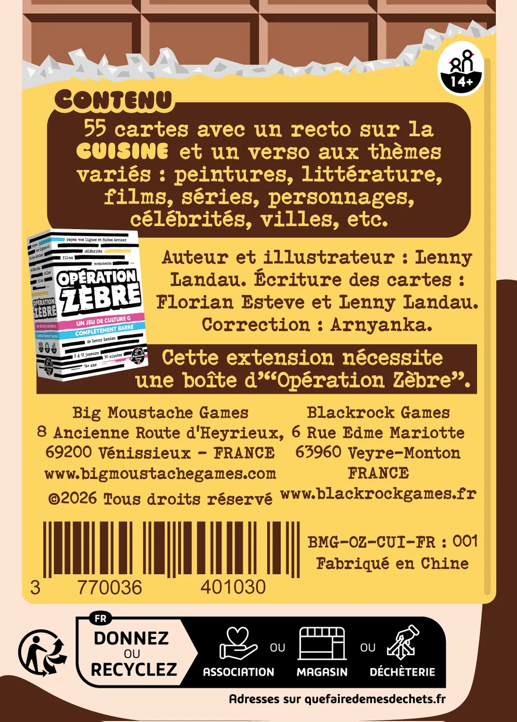 "Opération Zèbre : Extension Cuisine" est une extension de 55 cartes recto-verso (soit 110 nouvelles cartes à faire deviner) introduisant de nouveaux thèmes,dont la cuisine, à rajouter à votre jeu de base.