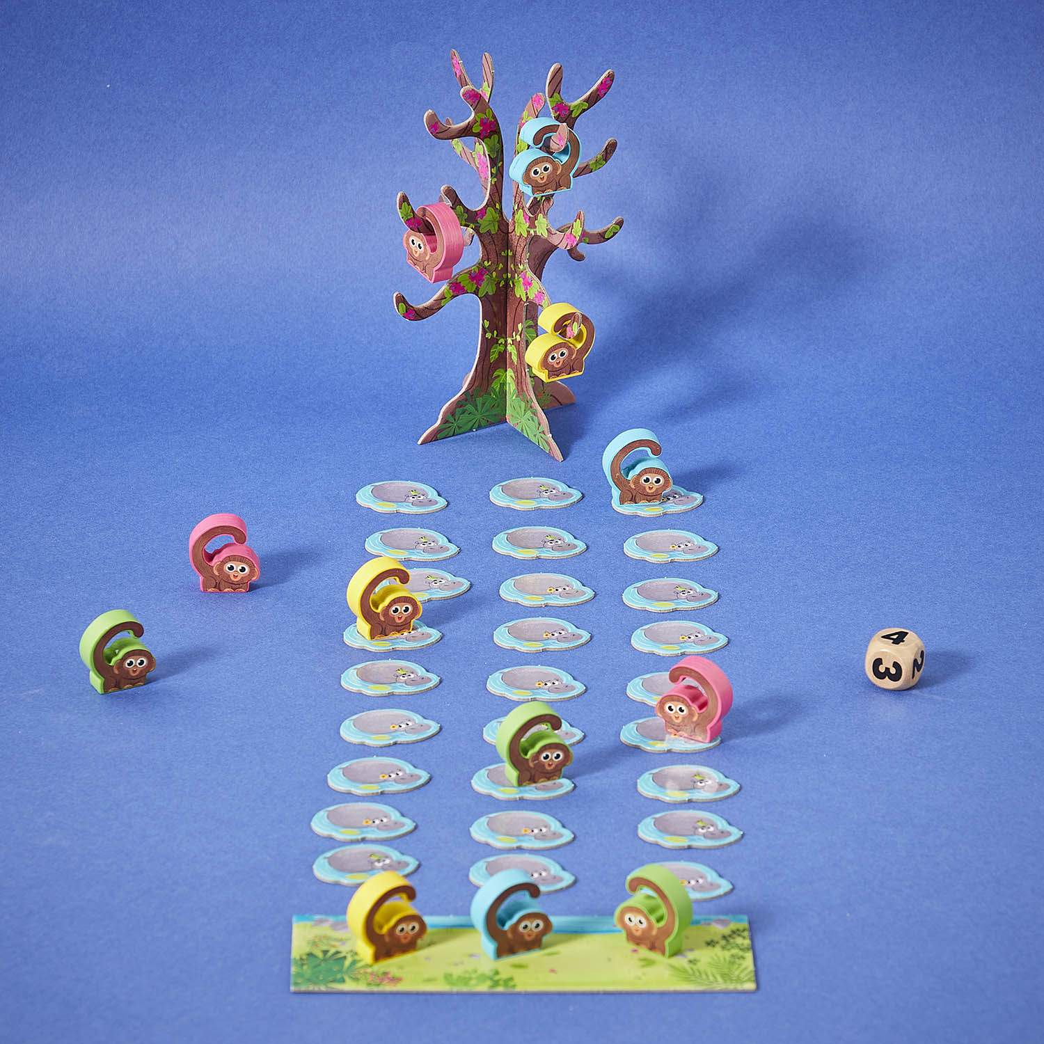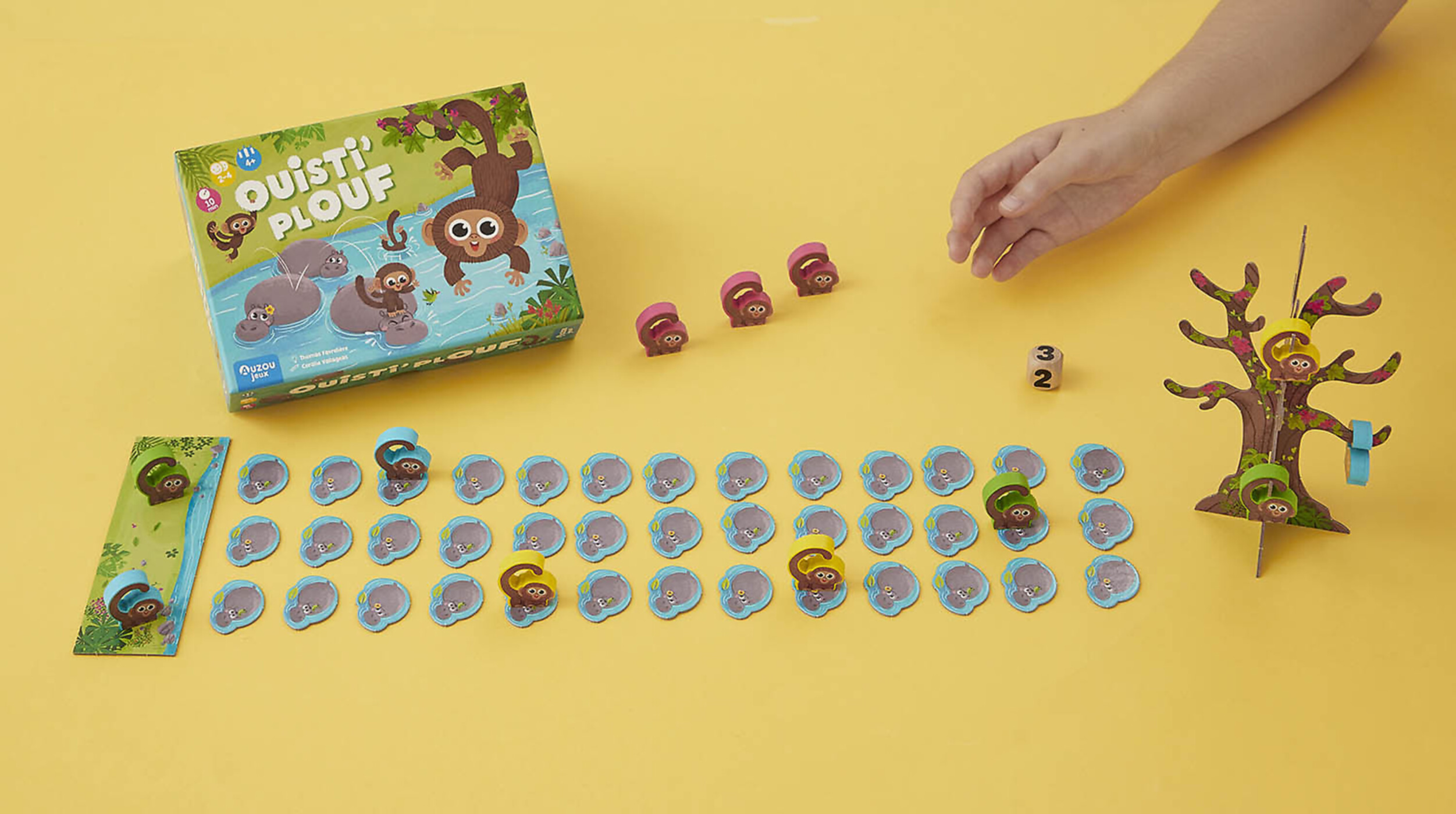 Contenu : 39 tuiles Hippo / 1 rive de départ / 12 pions Ouisti' en bois / 1 arbre en 3D / 1 dé en bois