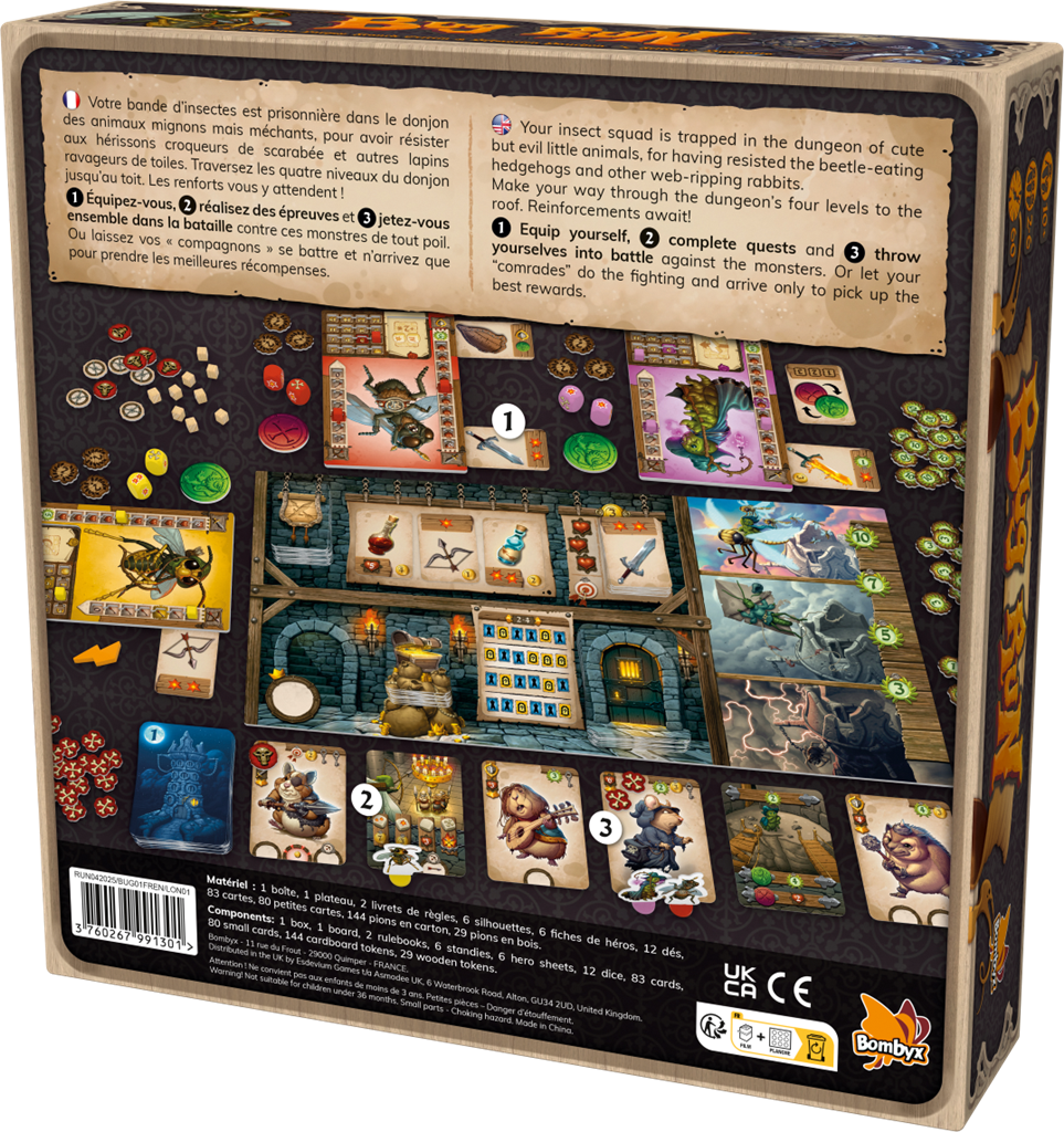 Votre bande d'insectes est prisonnière d'un donjon, enfermée par des animaux habituellement mignons mais ici très méchants : hérissons croqueurs de scarabée et autres lapins ravageurs de toiles. Ensemble, traversez les 4 niveaux du donjon jusqu'au toit. En chemin, achetez de l’équipement, tuez des monstres, réussissez des épreuves. Lancez-vous dans la bataille contre ces monstres de tout poil : affrontez des animaux de plus en plus puissants, en comptant sur vos lancers de dés pour réussir. Vous devrez parfois faire des alliances pour combattre et parfois vous affronter entre joueurs. Vous pouvez aussi laisser vos compagnons combattre les montres et n'arrivez que pour récupérer les meilleur butins. A chacun sa stratégie ! Vous gagnez si vous avez le plus de points de victoire à l'issue de l'évasion finale.