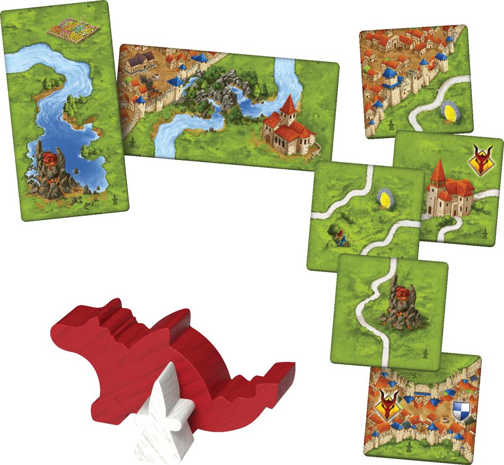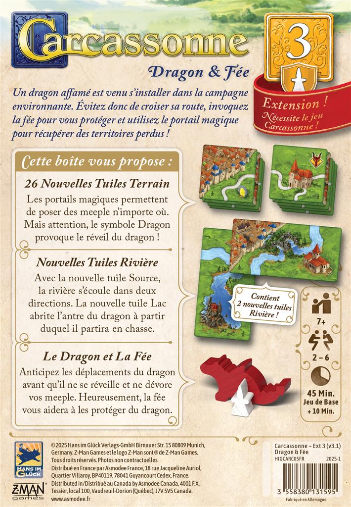 Avec l'extension Carcassonne Dragon & Fée, découvrez de nouvelles mécaniques. Anticipez les déplacements du dragon avant qu'il ne se réveille et ne dévore vos meeple. Heureusement, la fée vous aidera à les protéger. Avec la nouvelle tuile Source, la rivière s'écoule dans deux direction. La nouvelle tuile Lac abrite l'antre du dragon. Enfin, les portails magiques permettent de poser des meeple n'importe où : mais attention au symbole Dragon qui provoque le réveil de la bête.