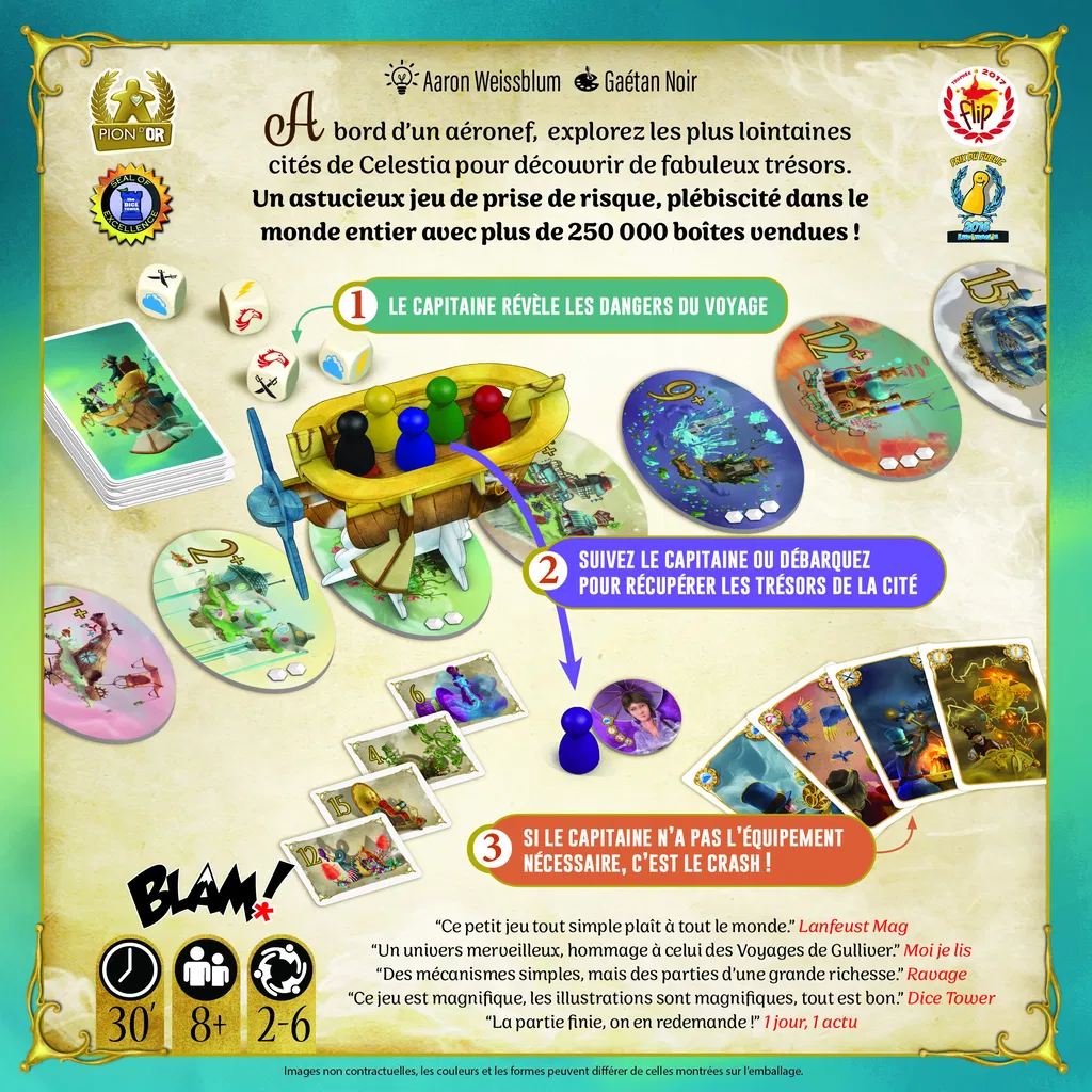 Prenez place dans l'aéronef et partez sur les traces de Gulliver qui chercha en vain le monde fantastique de Celestia. En quête des trésors des cités célestes vous devrez vous défaire des orages, des pirates Lockhars et des oiseaux-Damok qui figurent sur les dés. Dans le jeu Celestia, l'aéronef vole grâce au capitaine, qui change à chaque étape du vol, et qui doit fournir les cartes nécessaires pour la progression. Mais le capitaine possède-t-il les cartes ? Bluffe-t-il pour s'envoler seul vers des étapes beaucoup plus rentables ou tente-t-il de provoquer un crash pour empêcher l'équipage de gagner une carte récompense ? Dans le jeu Celestia la tactique est reine mais une belle place est également laissée à la chance. Ce qui fait des petits et des grands de redoutables adversaires.