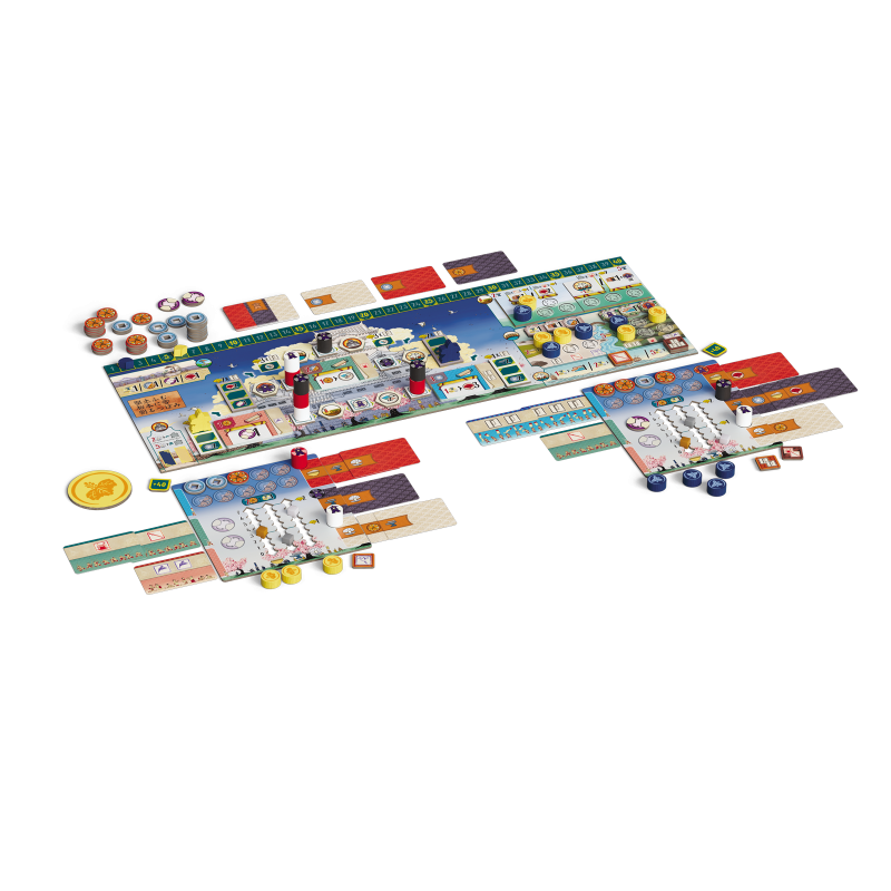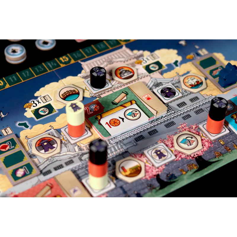 Dans Le Château Blanc – Duel , deux clans s’affrontent pour exercer leur influence à la cour du Héron Blanc, en gérant les ressources et en faisant preuve de stratégie. À chaque tour, vous utiliserez leurs jetons Lampe pour obtenir des ressources et activer des actions. Parmi les actions disponibles, vous pouvez acheter et améliorer des cartes Influence, placer des sceaux de clan sur les jardins et les terrains d’entraînement, déplacer votre courtisan entre les cercles d’influence ou commercer avec les Portugais. Ces actions vous permettront d’accumuler une série d’icônes – drapeaux, katanas, kabutos et origamis – qui vous rapporteront des points. Le vainqueur est celui qui en obtient le plus.