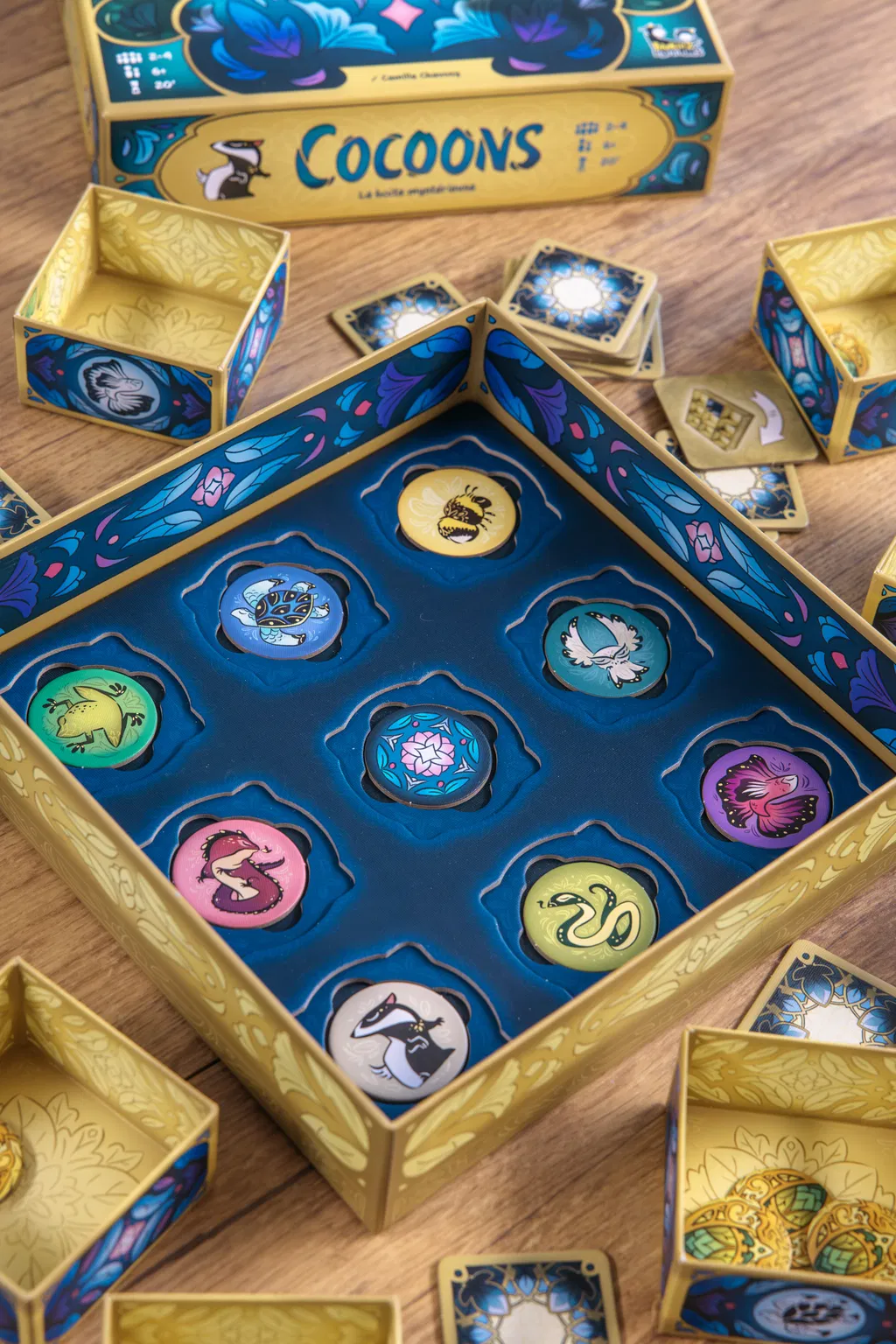 Dans Cocoons, vous devez coopérer pour libérer les gardiens égarés dans la boîte, puis les replacer dans leurs cocons respectifs. À votre tour, dépensez un jeton d'action pour faire glisser un cocon, comme dans un jeu de taquin, et révéler ainsi de nouvelles informations : chaque joueur ne voit que les indices en face de lui, et il faut donc bien communiquer entre vous pour identifier les cocons ! Si vous dévoilez une trappe au fond de la boîte, ouvrez-la pour activer son effet et découvrir l'animal gardien caché dessous. Vous pouvez désormais déplacer ce gardien dans son cocon, si vous l'avez déjà localisé. Une fois que tous les gardiens ont rejoint leur cocon, retrouvez le jeton de départ pour sceller votre victoire. Mais attention : vous devez y parvenir avant d’arriver à court d’actions ! Au fil de vos parties, ajoutez de nouvelles trappes pour des défis de plus en plus relevés !