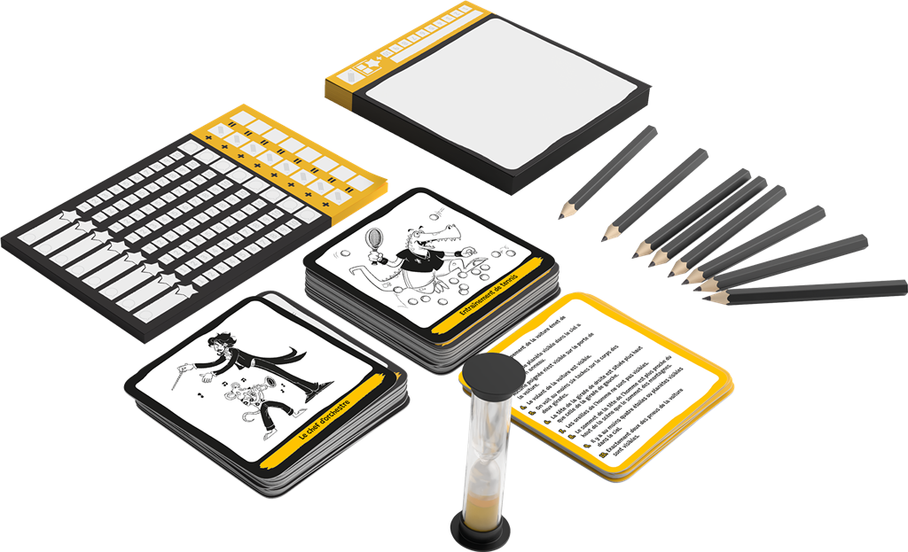 200 cartes, 8 crayons, 1 sablier, 1 carnet de score, 1 rodoïde rouge, 1 livret de règles