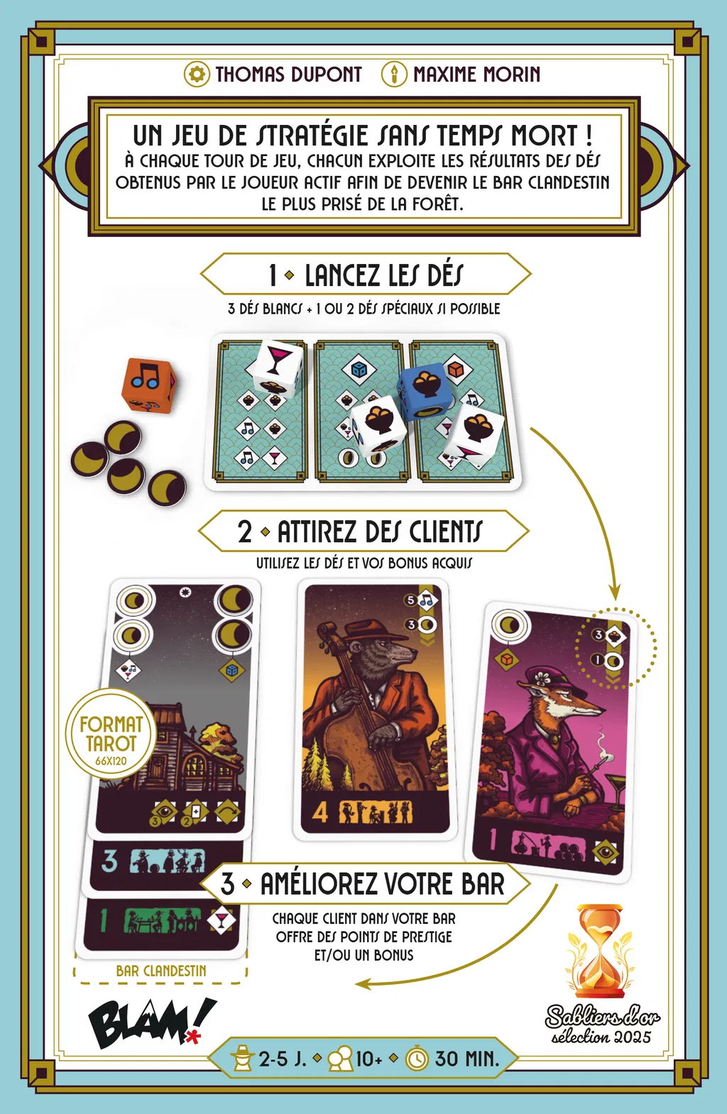 Plongez dans l’univers secret de la prohibition avec Moonshine, un jeu de société original et immersif ! À la tête de votre bar clandestin, gérez au mieux vos ressources interdites pour attirer des clients influents et faire prospérer votre établissement dans l’ombre. Faites les bons choix stratégiques pour développer votre réputation et devenir l’adresse la plus prisée de la forêt. Un jeu alliant ambiance, stratégie et immersion, idéal pour les amateurs d’univers mystérieux et raffinés.