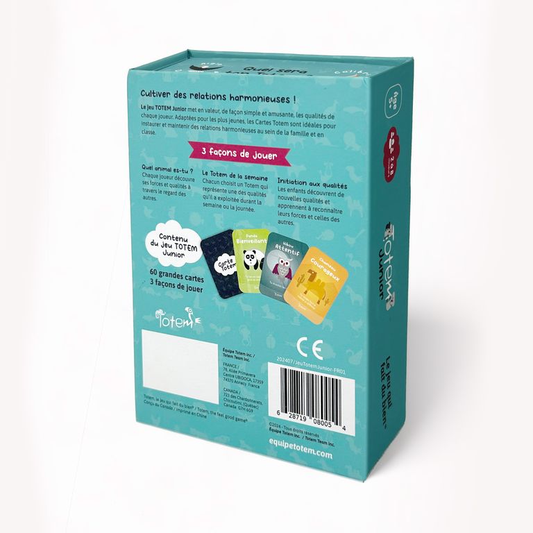 Totem Junior est bien plus qu'un jeu : c'est un véritable OLNI (Objet Ludique Non Identifié) qui débarque dans vos soirées, sans compétition ni coopération. Son but ? Offrir des outils simples mais puissants pour libérer un flot d’amour et de bienveillance. Autour de la table, chaque personne va découvrir son totem, un duo unique composé d’un animal et d’une qualité qui symbolisent ses forces et sa personnalité. Ici, il n’y a ni gagnants ni perdants. Les joueurs se prêtent simplement à l'exercice de reconnaître et d'explorer les qualités des autres, sans jugement. Le reste se déroule naturellement, et au fil de la partie, les émotions s’invitent, laissant place à des moments sincères, profonds et touchants. Totem Junior est une invitation à se voir autrement, à reconnaître la beauté des autres et à accueillir la sienne. Un moment de partage unique et inoubliable.